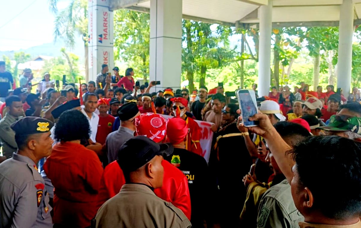 Massa berpakaian adat datang membawa aspirasi. Sasadu yang memiliki makna simbolik, identitas budaya Masyarakat Adat Wayoli, terikat kencang di kepala mereka. Motilo’a, janur kuning simbol ikatan, kesatuan warga desa-desa bagian dari suku mereka turut melingkar di tubuh.