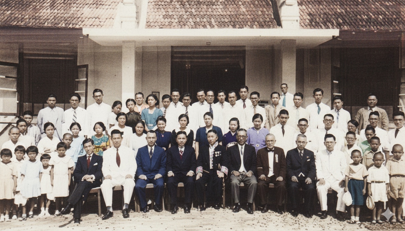 Keterangan Foto: Foto tanggal 11 Februari 1941 (Kigensetsu), di halaman depan Konsulat Jepang. Duduk di barisan depan adalah orang dewasa, keempat dari kiri adalah Isamu Oiwa, dan di sebelah kanannya adalah Konsul Jepang di Manado. (Foto hasil restorasi AI dari asli yang dipublikasikan di Majalah Informasi Sulawesi.)